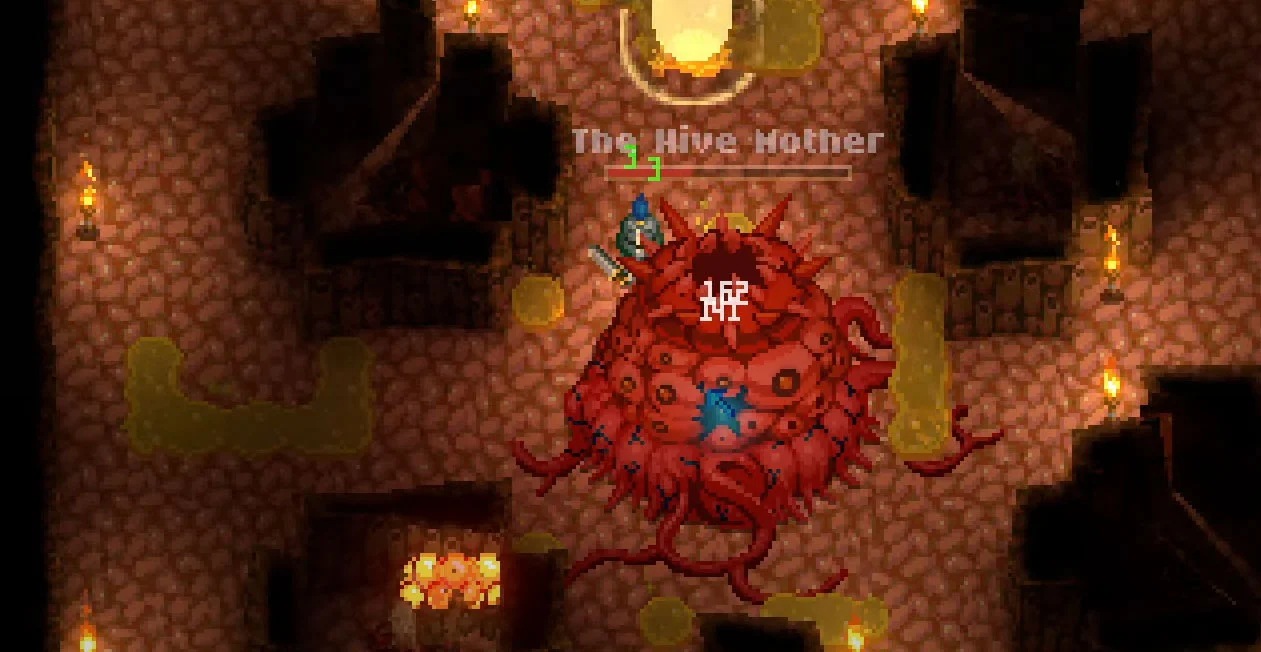 To defeat The Hive Mother in Core Keeper, set up a small base next to her so you have a respawn point, then clear a 30×30 square around the boss. Run out of the area when The Hive Mother uses her acid attack, then run back into the room and attack in-between acid attacks. To make defeating her easier, destroy the larva she spawns before it hatches. See below for an in-depth guide on how to accomplish this.