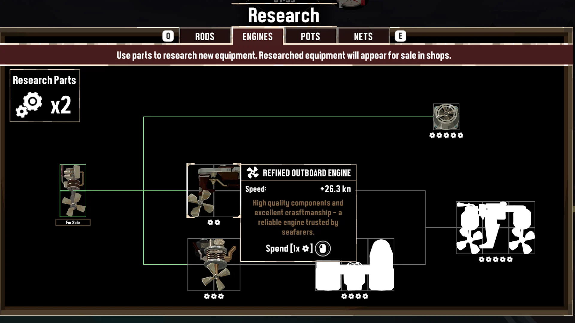You can research new equipment by docking at any town or location and clicking the gear icon next to the Rest button. From the Research screen, you can choose to learn new types of Rods, Engines, Pots, and Nets and increase the effectiveness of existing equipment.