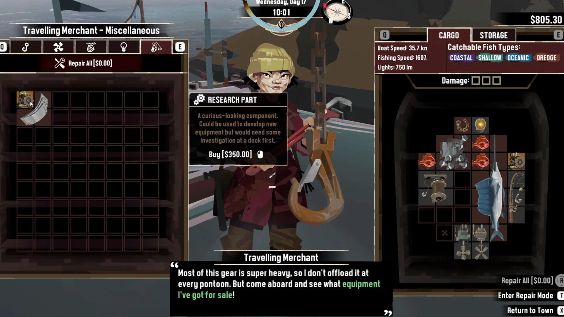 As you go deeper into the research tree, higher-end equipment tends to cost a lot more Research Parts. That said, it’s a good idea to always visit those “Shapes in the Deep” and other debris markers in the ocean to look for more Research Parts. And always visit those Travelling Merchants to see if they have any up for grabs!