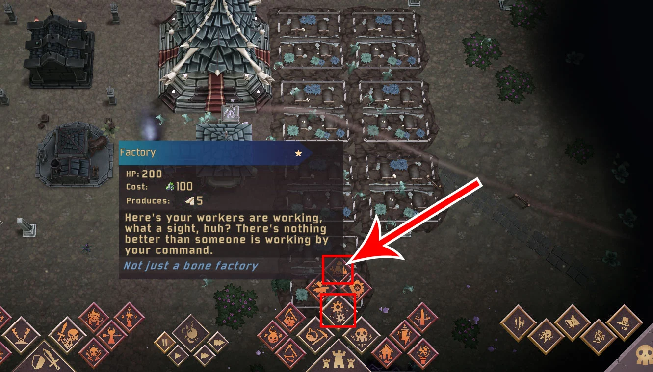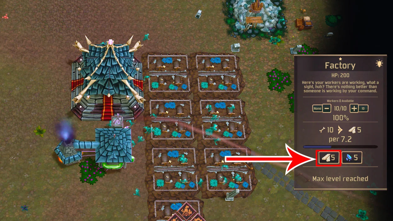 A Factory will cost 100 Ruin Stones to construct. Remember to assign workers to the Factory by clicking the + icon. Each time the blue bar fills up in the Factory, you’ll produce 5 Bonewood. The more workers you have assigned to the Factory, the faster the bar will fill up and the fewer materials your workers will need to complete the production of the Bonewood.