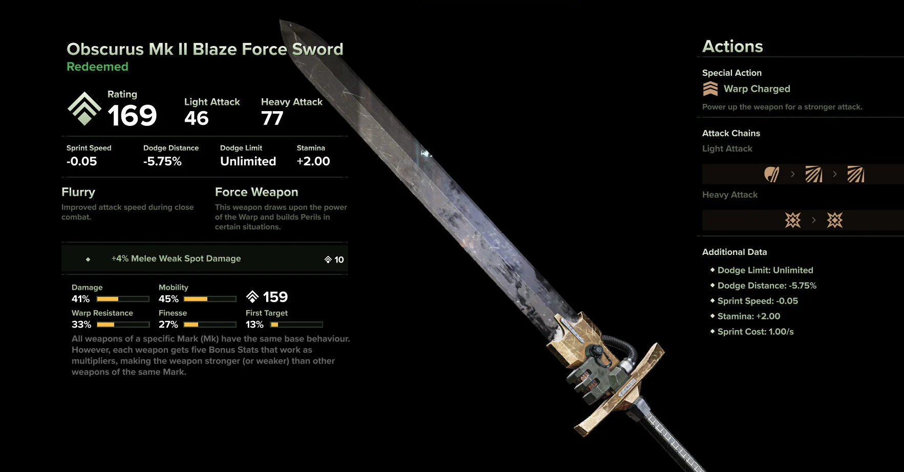The Force Sword is an S-Tier weapon because of its secondary action. When you charge the force sword, it will imbue it with bonus damage on the next attack, and most units will die in a single hit.