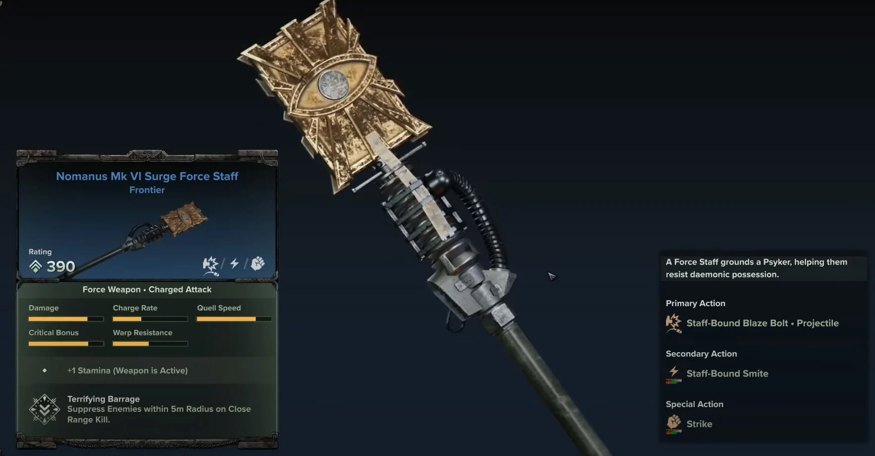 The Voidstrike Staff has great range and secondary action; The Blaze Bolt is a charged penetrating and AOE attack with knockdown. These attributes give Voidstrike great versatility, damage, range, and crowd control, which makes it the best staff for Psykers in the game.