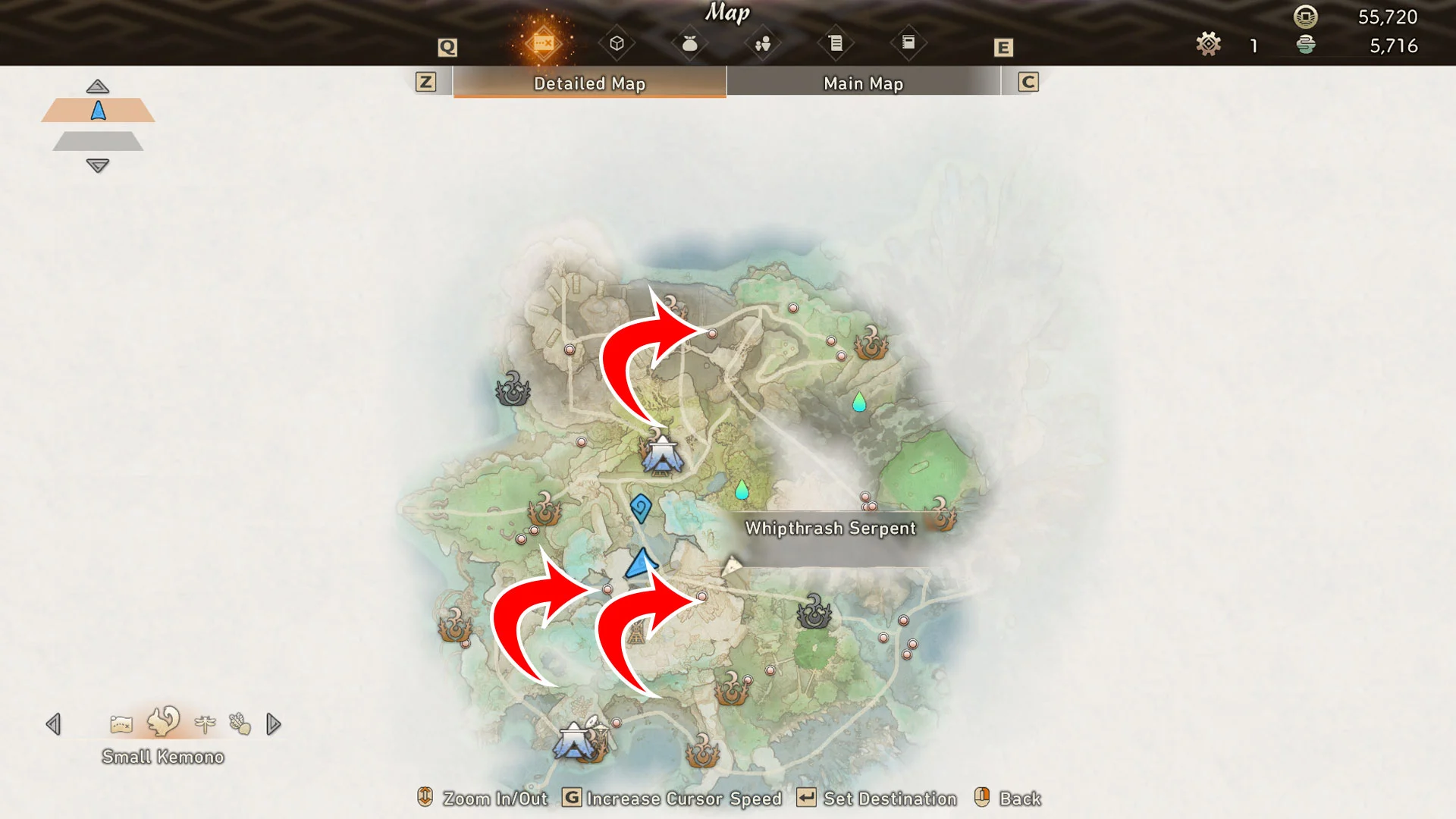 The location can change slightly, so open up your Detail Map and change the filter to Small Kemono. You can locate all of the Whipthrash Serpents by hovering your cursor over the dots.